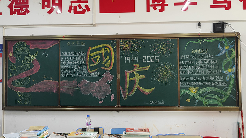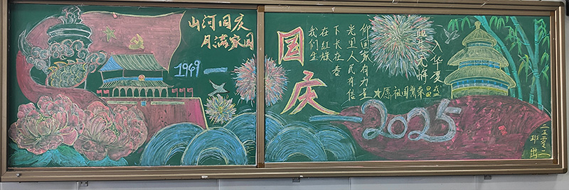 “盛世华诞,共谱华章”、“生存红旗下,长在春风里”等主题标语彰显着同学们对祖国的美好祝愿。有的班级黑板报上,不仅有祖国发展的辉煌成就,还融入了传统文化元素,将古韵与现代完美结合,表达了“以青春之名,书写清澈挚爱”的赤子之心。还有一些通过巧妙的构图和色彩搭配,展现了青年学子对祖国历史的尊重与对未来的憧憬。