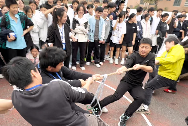 在所有学生项目结束后,操场迎来了前所未有的高潮——“学生科 vs 教务科”教师友谊拔河赛!平日里在三尺讲台谆谆教诲、在办公室辛勤耕耘的老师们,此刻化身为全力以赴的“运动员”。哨声一响,双方紧握长绳,卯足力气,奋力拉拽。场下的学生们瞬间沸腾,加油声、欢笑声、呐喊声响彻云霄,为自己的老师疯狂助威。